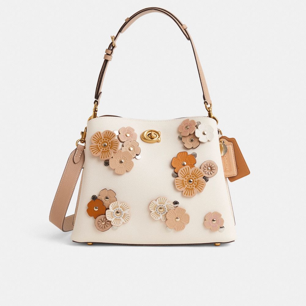 Reimagined by Ella Mulley with clusters of our dimensional Tea Rose appliqué in a sophisticated neutral color palette, this everyday style has been expertly cleaned, conditioned and restored. Our talented craftsperson Angel Penaloza hand-decorated the front with die-cut leather blooms and peek-a-boo rivets, then added a playful repurposed charm. The Willow is the perfect go-anywhere shoulder bag with space for all of your day-to-day essentials. Crafted of colorblock polished pebble leather, it has an organized interior with one zip compartment, two open compartments and a snap pocket. The roomy trapezoid shape secures with our Signature turnlock closure and can be carried by hand, on the shoulder or crossbody.