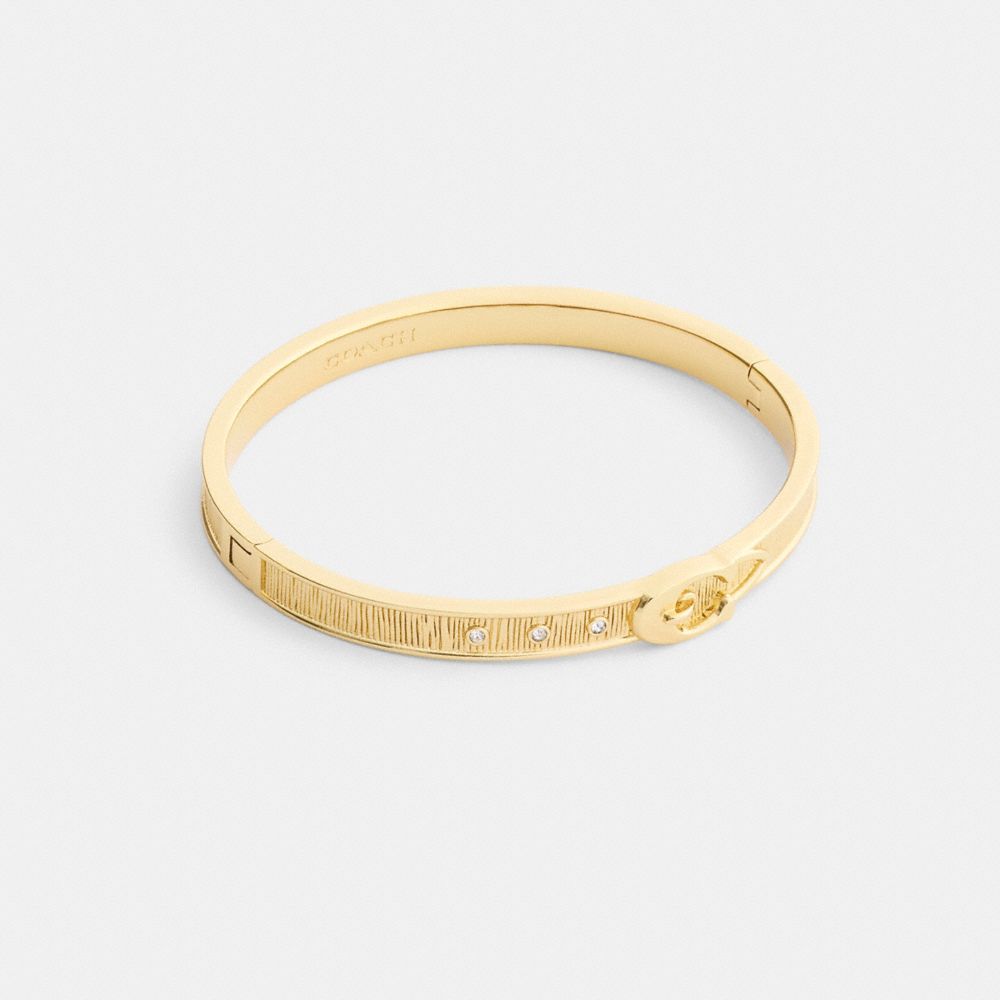 A heritage style for everyday, this belt-inspired bangle features our Signature buckle. The brushed textured bracelet is finished with an easy hinged closure.