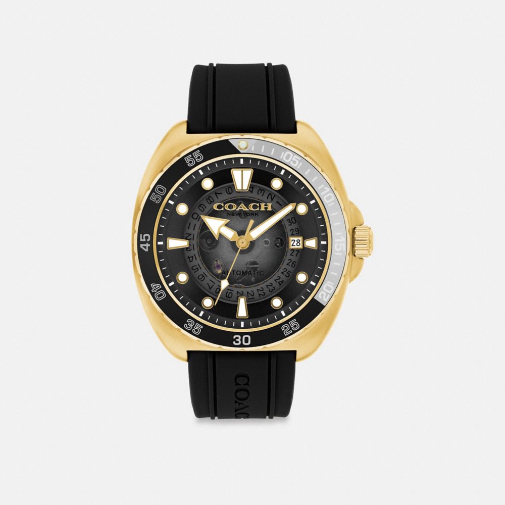 Made for adventures near and far, the Charter is a sporty multi-function style designed for life on the move. Finished with a silicone rubber strap, this gold tone watch features a gradient tinted dial with a sunray track and a date window at 3 o’clock. The open case back window showcases the automatic movement.