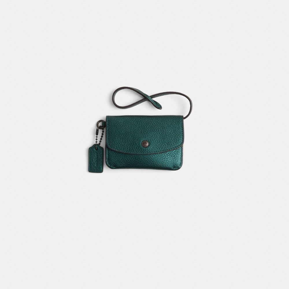 Crafted of metallic polished pebble leather, this flap-front pouch keeps cards and other small essentials secured in a two-pocket design that can be worn as a wristlet or attached to a bag. It's finished with a metallic interior and snap closure.