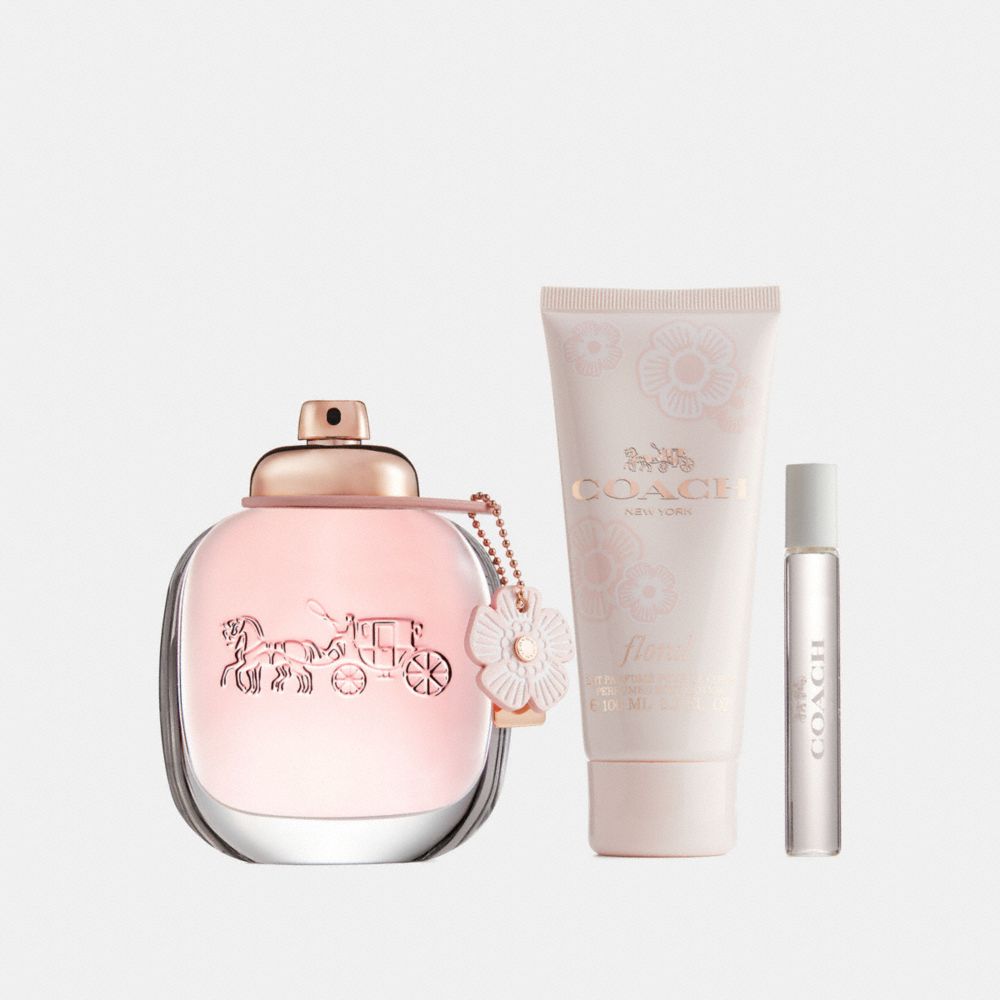Coach Floral Eau de Parfum opens with a splash of citrus and a touch of effervescent pink peppercorn with radiant pineapple sorbet. The heart reveals a bouquet of fragrant flowers—rose tea, jasmine sambac and gardenia—before an enveloping dry-down to elegant creamy wood, patchouli and musky notes. Layer on our signature scent with a travel-friendly gift set that includes a 3 oz. spray, a 3.3 oz. lotion and a 0.33 oz. rollerball.