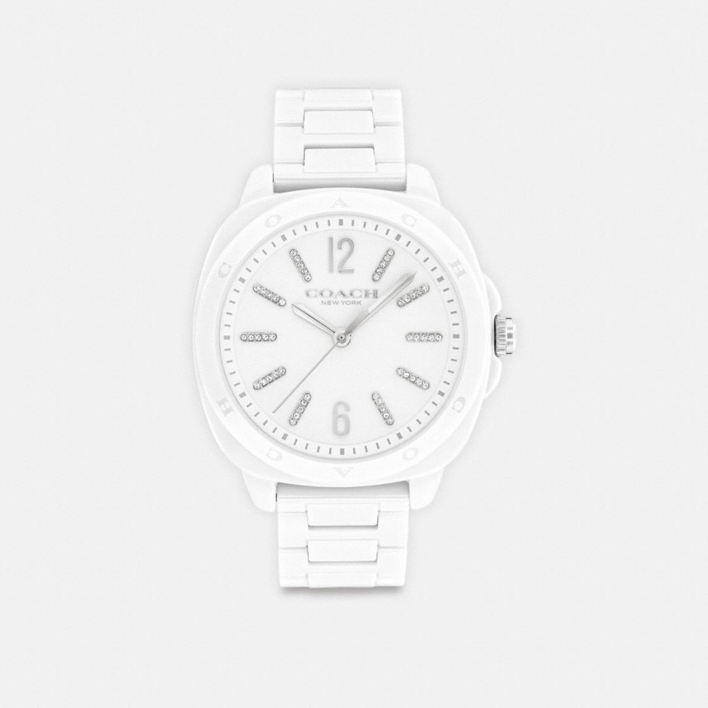 COACH®,Kitt Watch, 38 Mm,Analog,Crystal,Lacquer,Ceramic,Quartz,Logo,Word Embellishment,Water Resistant,Color Metal,Casual,White,Front View