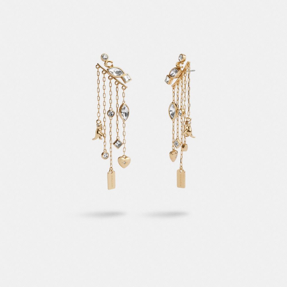 A dramatic look for day or night, these front-back earrings feature iconic Coach motifs. Designed with one post, the bold style features multiple stud accents in the front and delicate chain accented with sparkling glass crystals and charms in the back.
