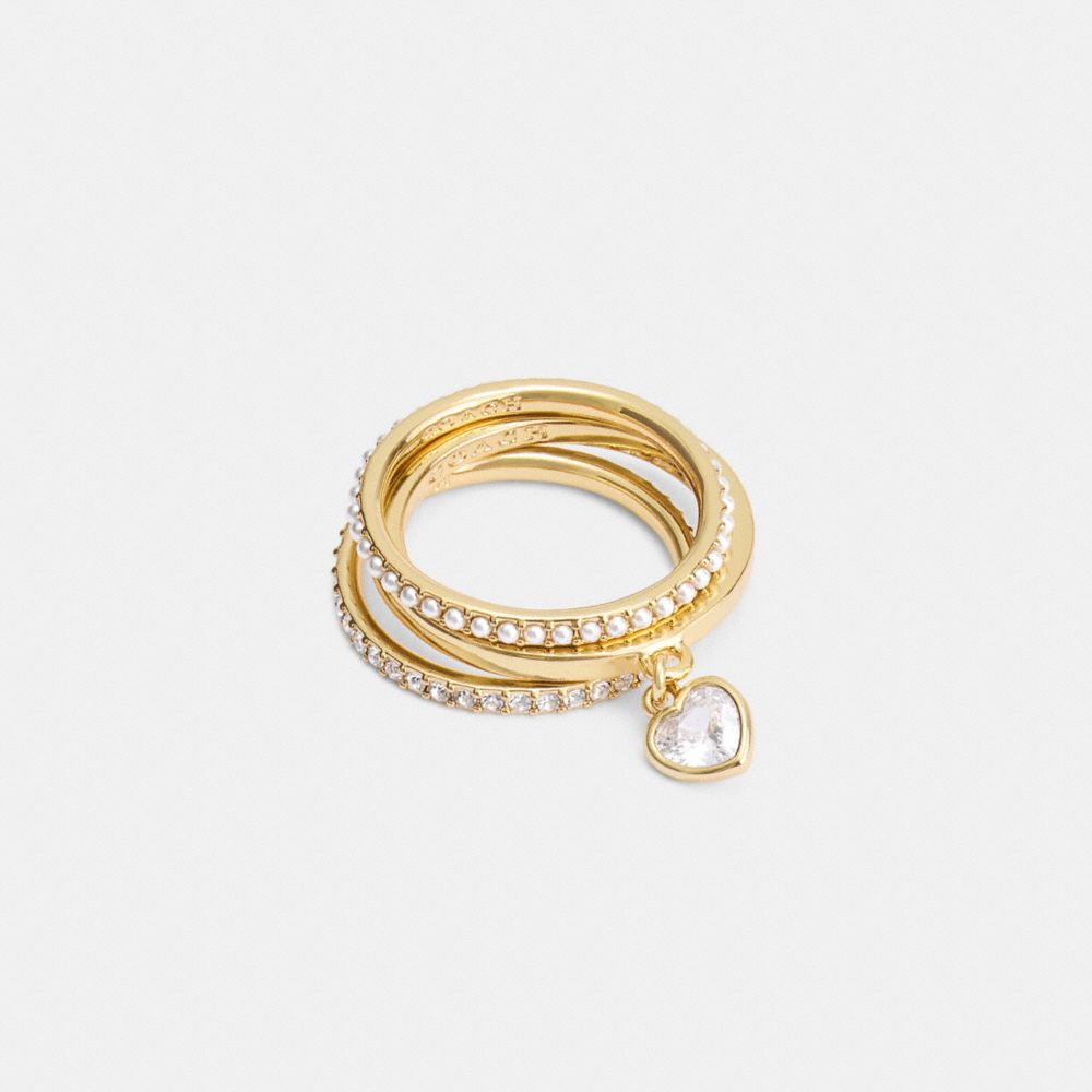 This set of stackable rings add a touch of sparkle to any look. It includes one luminous glass pearl band, one shimmering pavé crystal band and a bezel-set crystal heart ring. Wear together or separately.