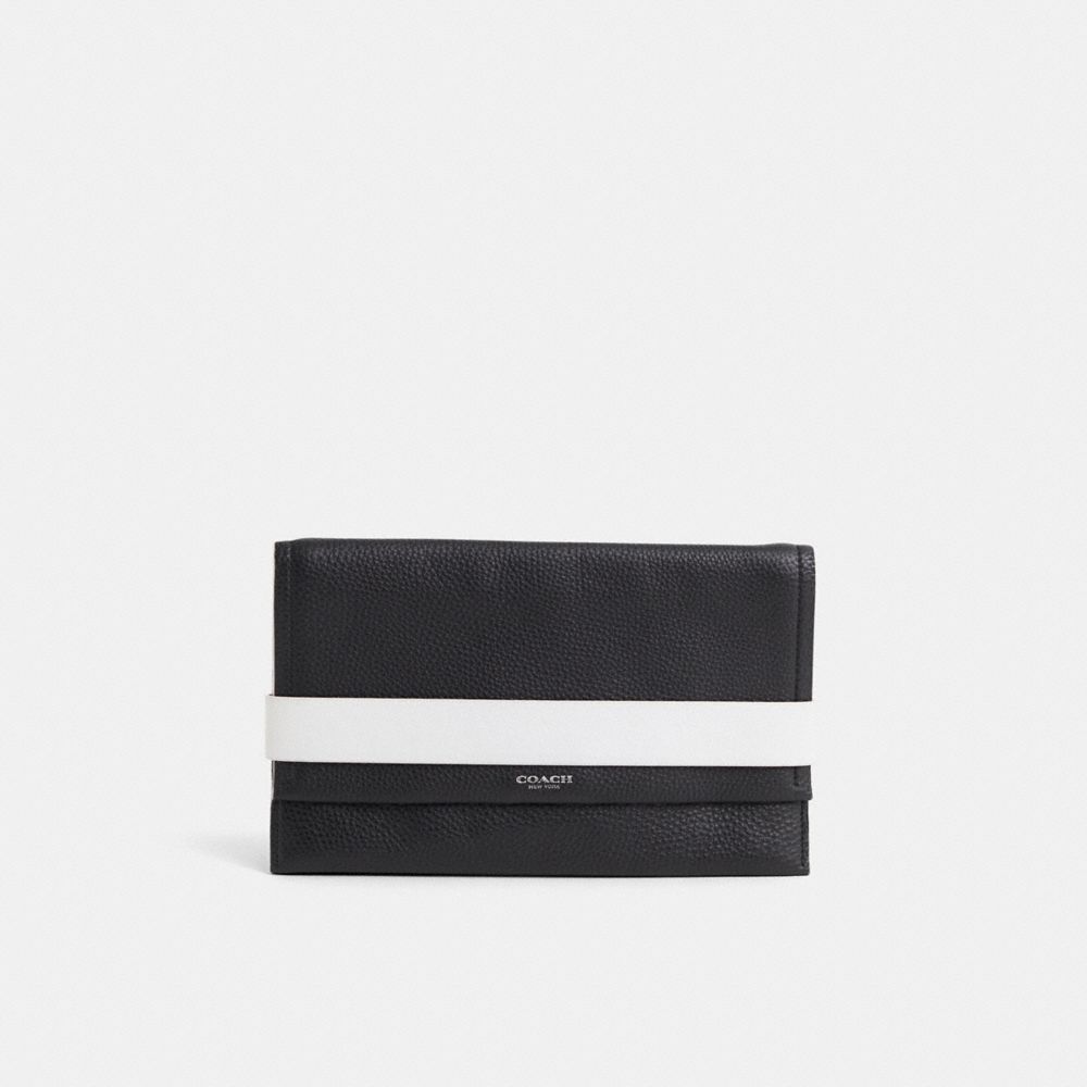 This slender, hand-held design has the look of a portfolio in leather and a striking graphic effect. Its magnetized flap front opens to reveal two fabric-lined compartments with room for the day's essentials, along with a zip pocket for added security.