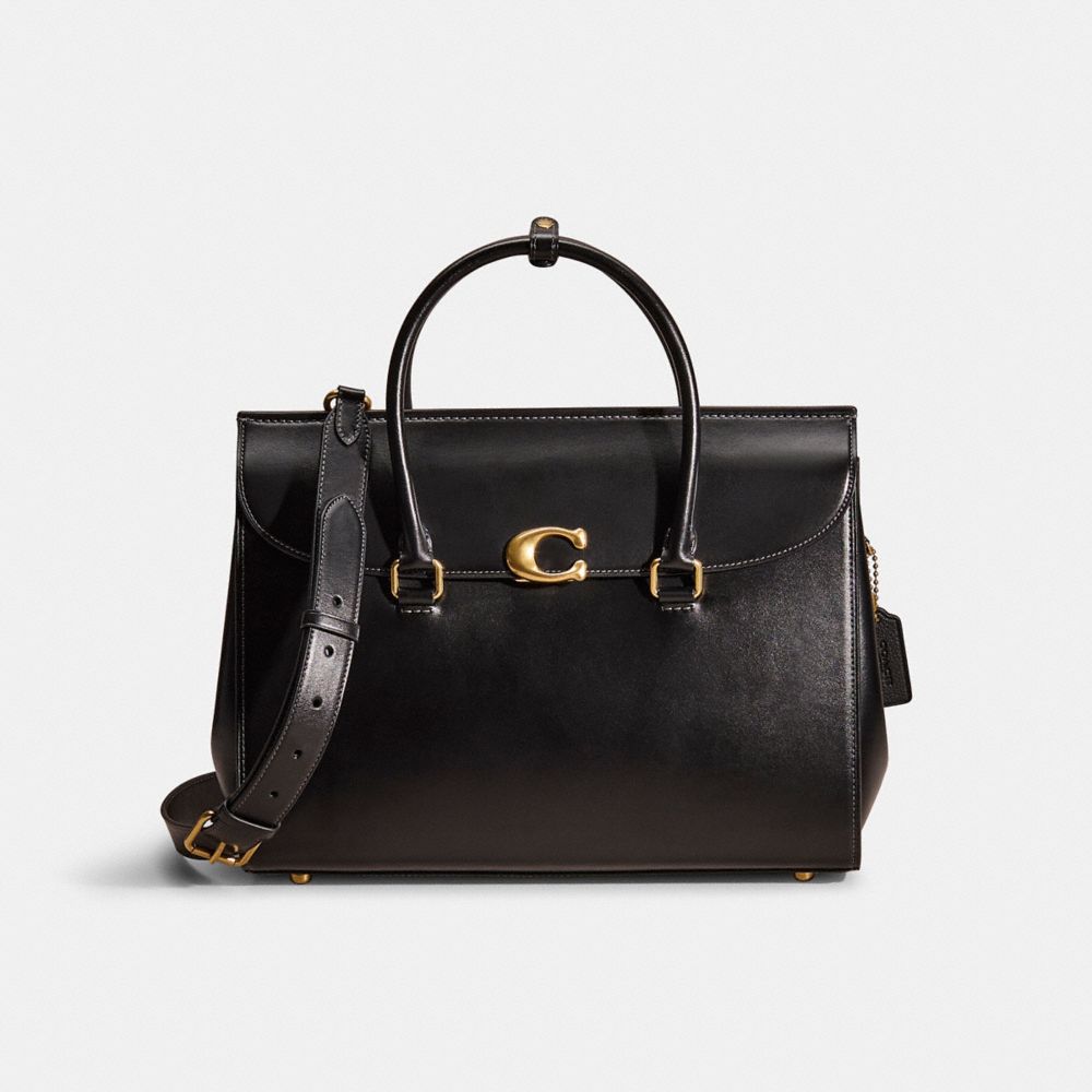 Our Broome has all the effortless cool of its namesake Soho street. The spacious foldover silhouette is crafted of luxe refined leather with a high shine finish and secures with our pushlock "C" closure. Featuring pockets inside and out for easy organization and room for a 16" laptop, carry it by hand or use the detachable strap to wear it crossbody.