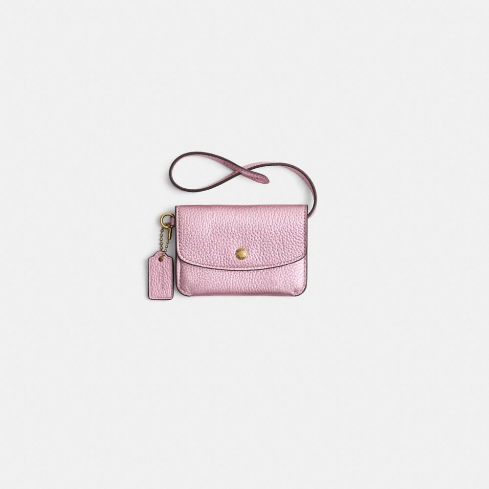Crafted of metallic polished pebble leather, this flap-front pouch keeps cards and other small essentials secured in a two-pocket design that can be worn as a wristlet or attached to a bag. It's finished with a metallic interior and snap closure.