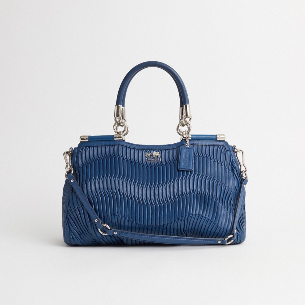 Defined by our iconic dowel detail, the gathered leather Carrie bag features an organized interior with multifunctional pockets and a zip-top closure. Carry by the top handles or attach the strap to wear crossbody.