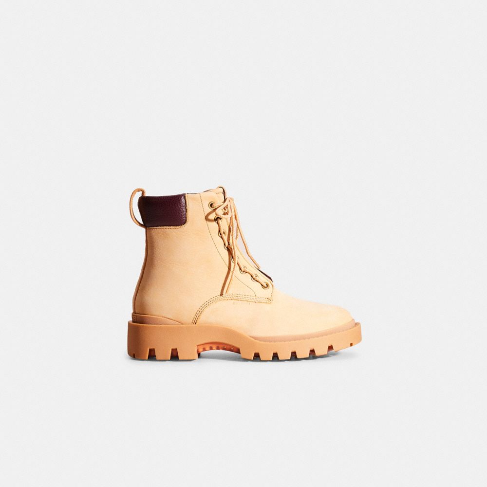 For city streets and off-road terrain, our lightweight Boot is made with proprietary Coach CitySole technology for maximum comfort and flexibility. Based on vintage military styles, this lace-up silhouette sits at the intersection of fashion and function. Crafted of nubuck leather, it features a layer of shock-absorbing cushioned pods that provide all-day support. It's finished with a durable lug sole for superior movement and traction.