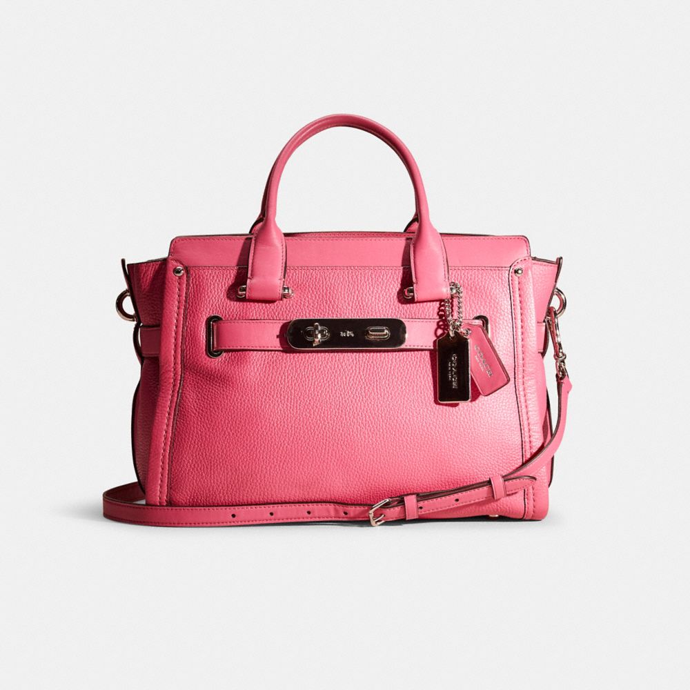 Statement belting with double-turnlock hardware adds "swagger" to this signature Coach style named for a bold, brass-trimmed Bonnie Cashin design from 1967. Crafted of pebble leather, it has an organized interior and a detachable strap.
