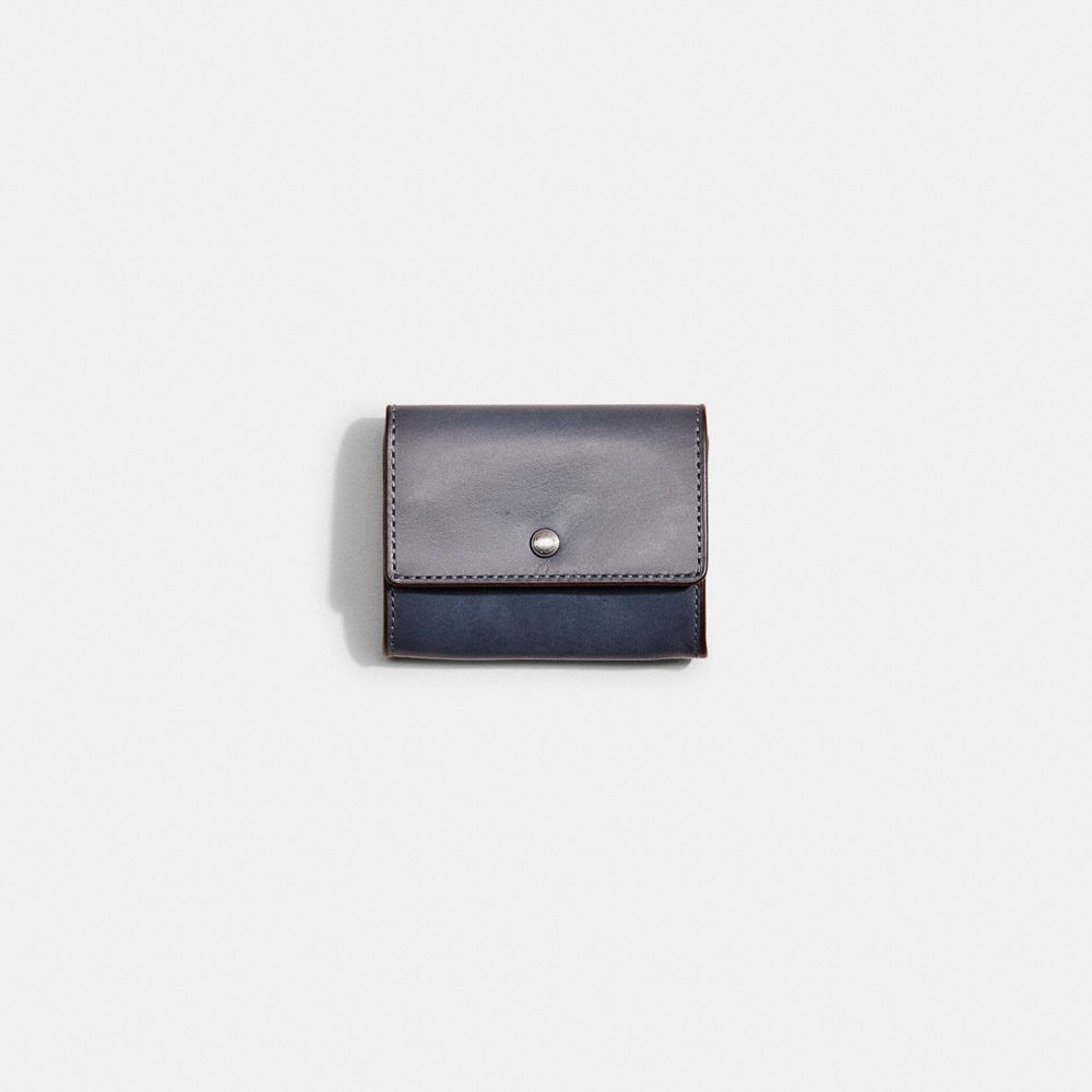 This compact case unsnaps to reveal three card slots and an expandable coin pocket. It's crafted of richly grained water buffalo leather that naturally burnishes over time.