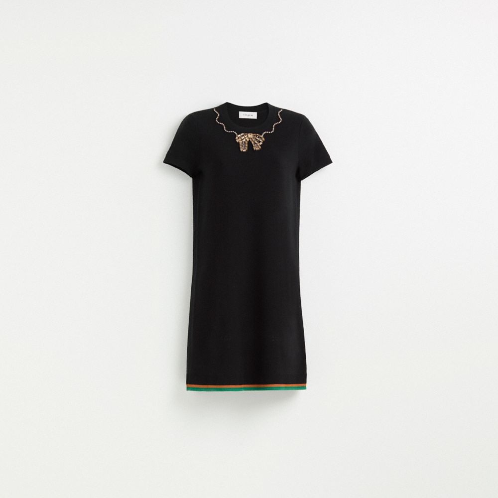 A downtown, undone take on dressing up. This relaxed-fit sweater dress is crafted of wool and features glass stone rickrack chain detail along the neckline, and a trompe l'oeil bow. It's finished with bold striped trim at the hem.