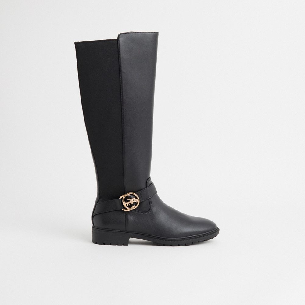 Crafted of smooth leather, our Farrah is a sleek equestrian-inspired riding boot. It's finished with polished hardware featuring our iconic Horse and Carriage motif.