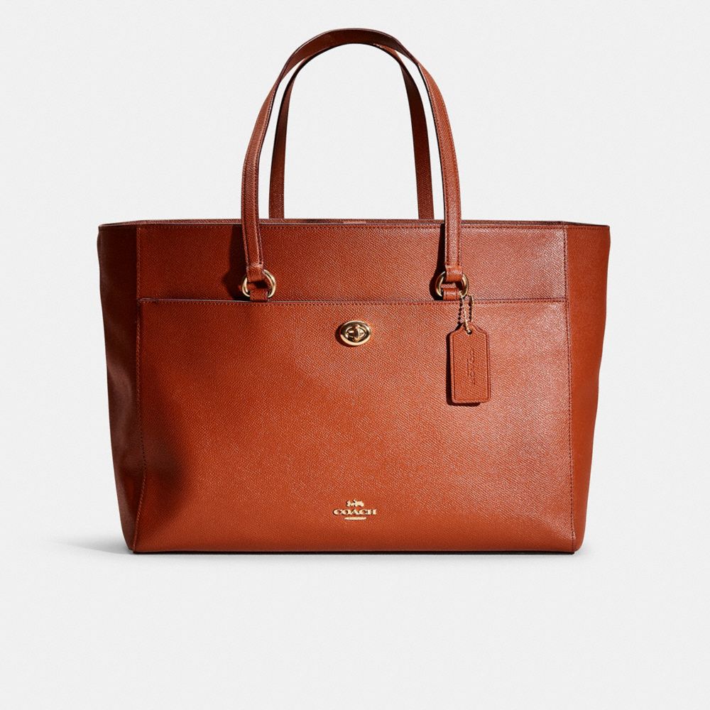 Our Folio Tote features a well-organized interior with space for a 15" laptop. Finished with our iconic turnlock closure, it's crafted of scratch-resistant crossgrain leather.