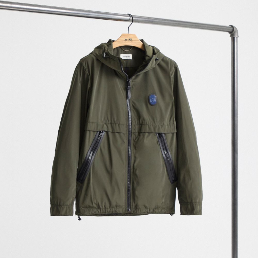 This lightweight, water-resistant windbreaker is a great transitional piece. The sporty hooded style is finished with our Coach retro graphic.