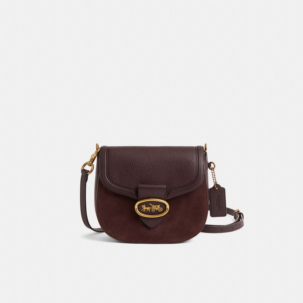 Featuring our iconic Horse and Carriage motif, this Kat Saddle Bag 20 is crafted in a mix of colorblock leathers and velvety suede. It has a two-compartment interior and includes an interchangeable webbing strap, plus a detachable strap for shoulder or crossbody wear.