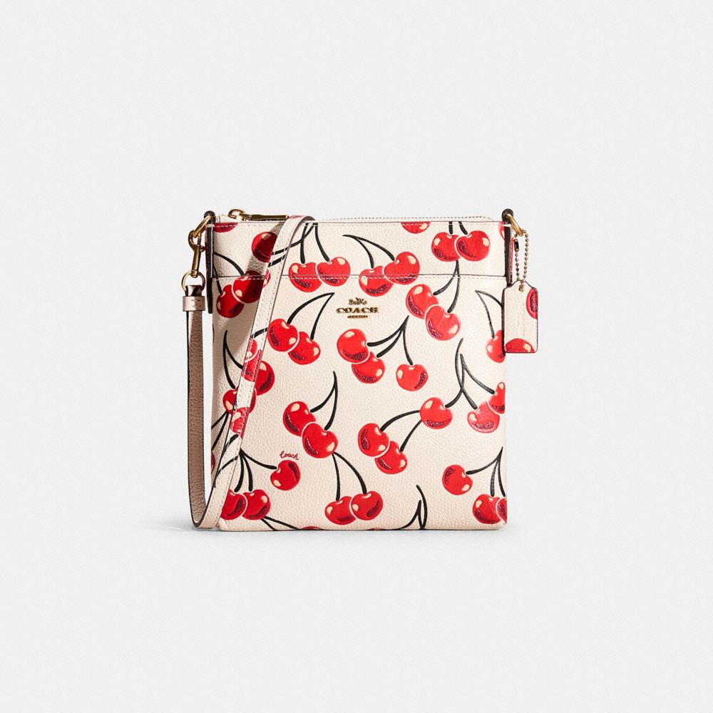 Crafted of polished pebble leather featuring a cheerful cherry print, the Kitt Messenger is a versatile crossbody perfect for weekends or travel. An exterior pocket gives easy access to essentials.