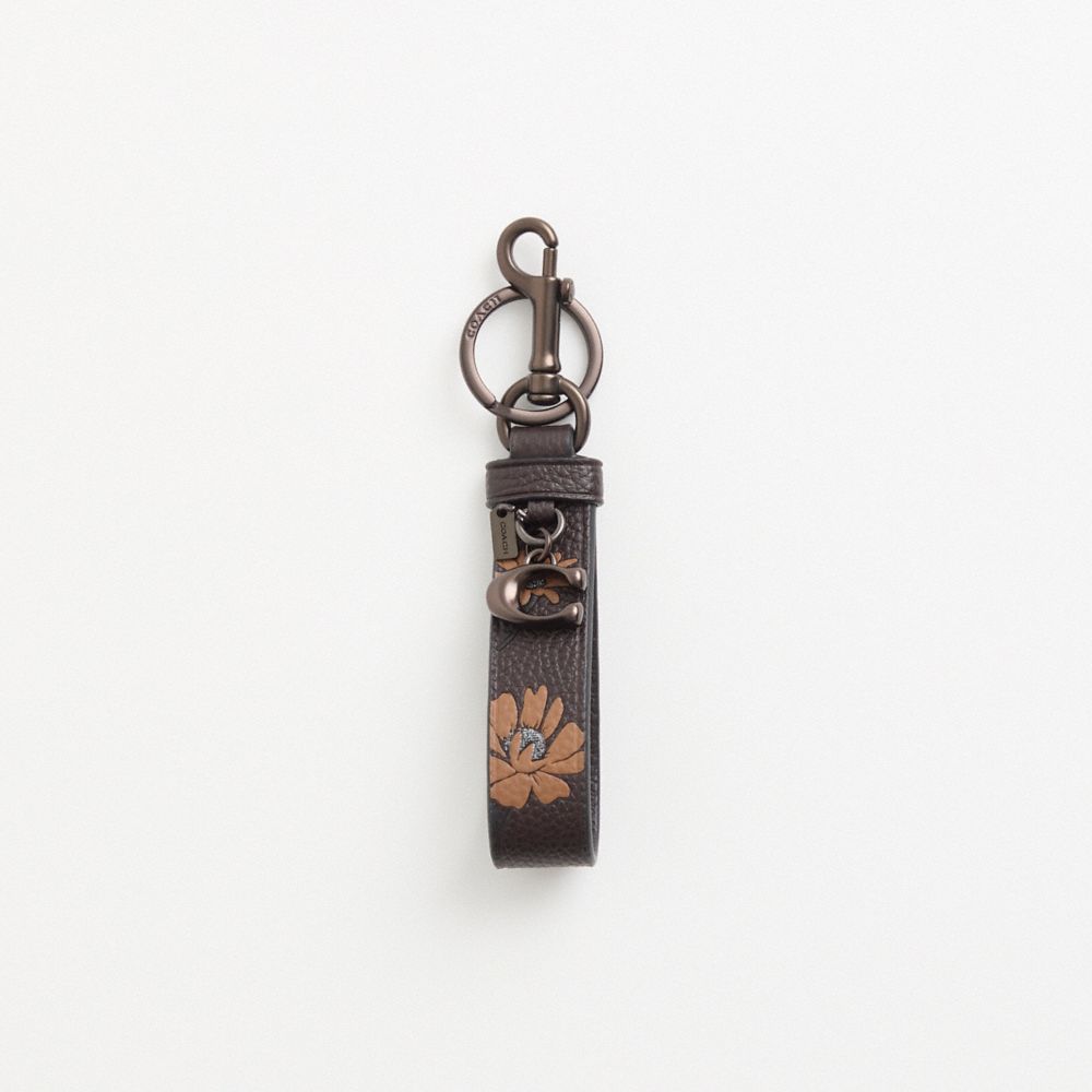 Round up keys with this polished pebble leather wrist strap featuring our darkly dramatic daisy print. Accented with a Signature charm and Coach hangtag, the dogleash clip allows you to attach it to a favorite bag.