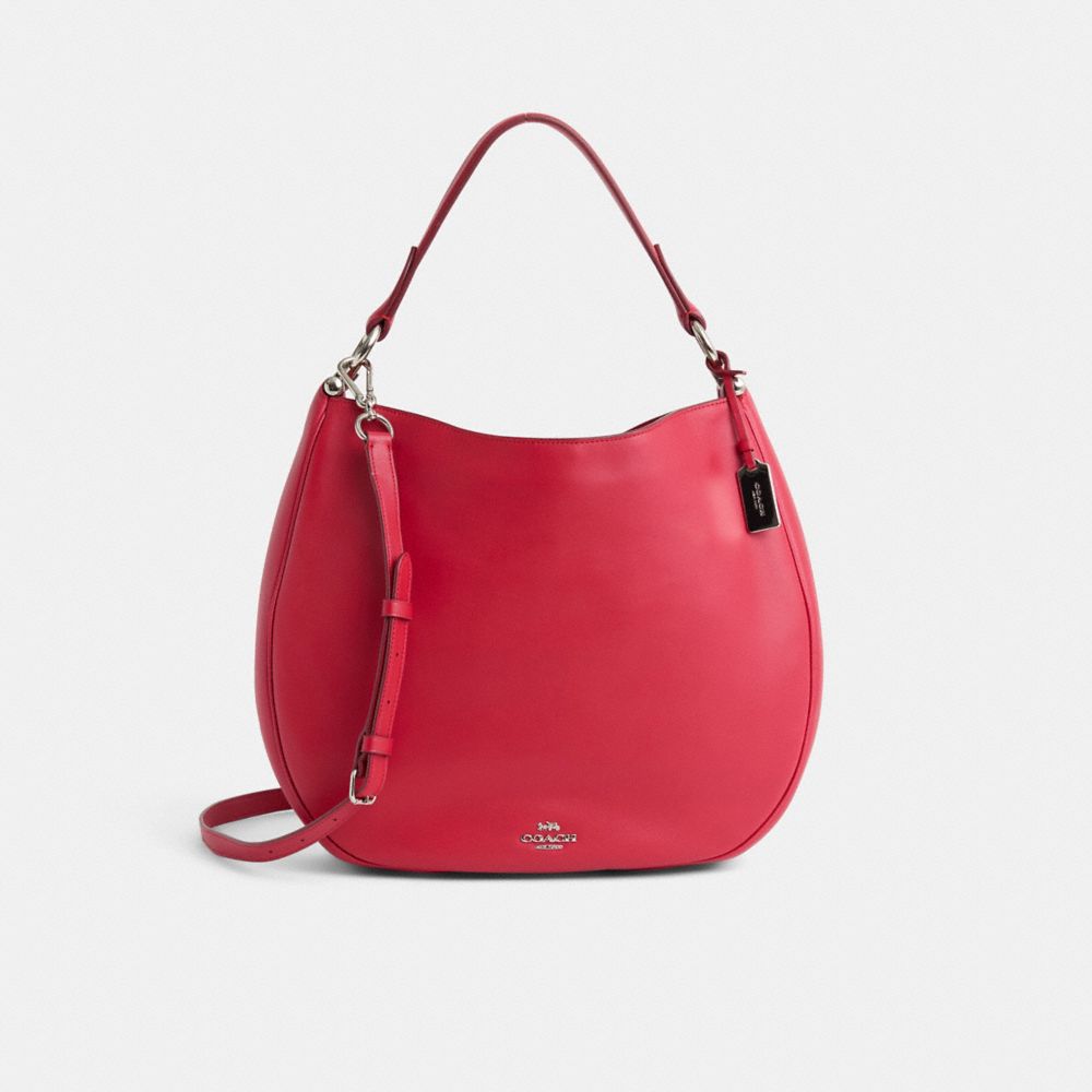 Soft and slouchy and crafted of supple glovetanned leather, this graceful silhouette is dressed up with striking hardware, including a polished metal hangtag. Zip and open pockets organize its leather-lined interior; the adjustable strap detaches for multiple wearing options.