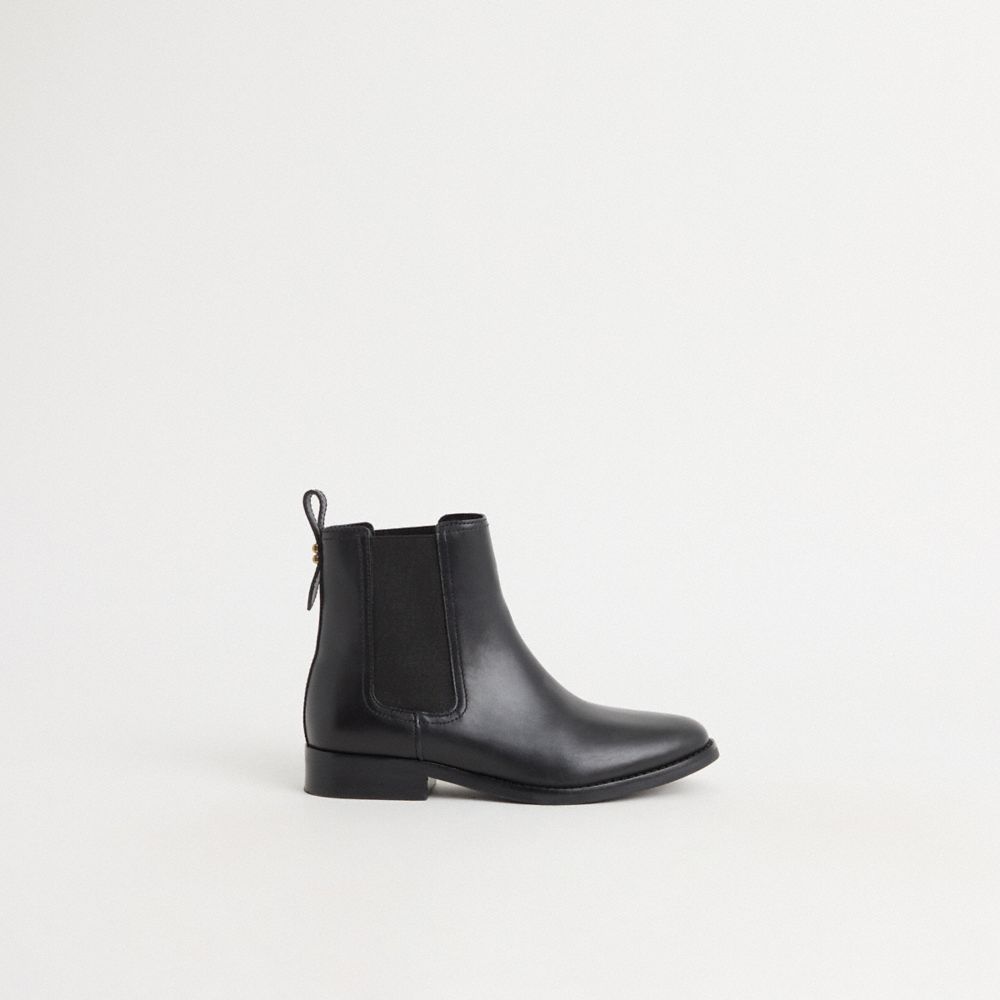 Street-ready with a rubber sole for great traction, our Maeve bootie is crafted of smooth leather. Featuring an elastic side gores for ease of movement and flexibility, the slip-on style is finished with our Signature hardware at the back pull-tab for a heritage touch.