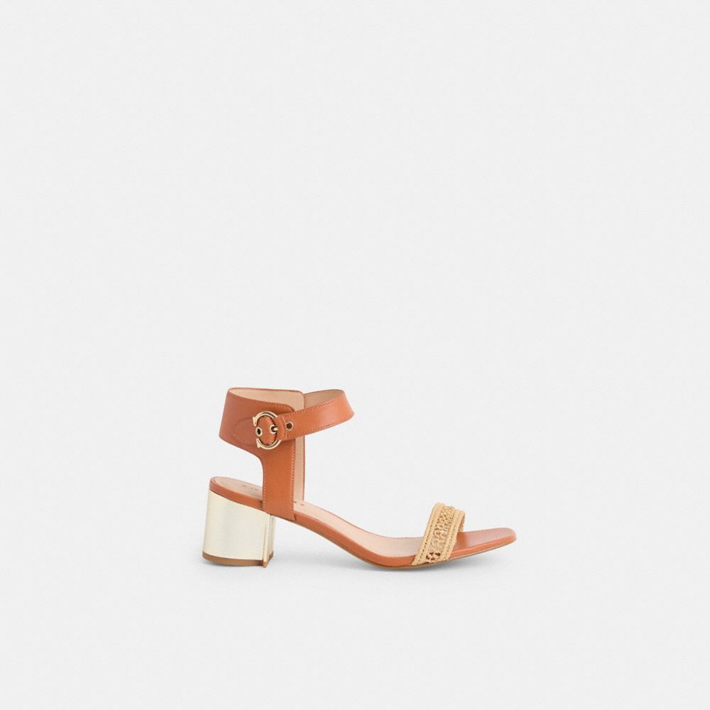 The Marci sandal is a fun pick for day or night with a lacquered block heel shaped in our Signature for understated Coach style. Crafted of smooth leather and woven raffia, the sturdy ankle strap secures with our Signature buckle.