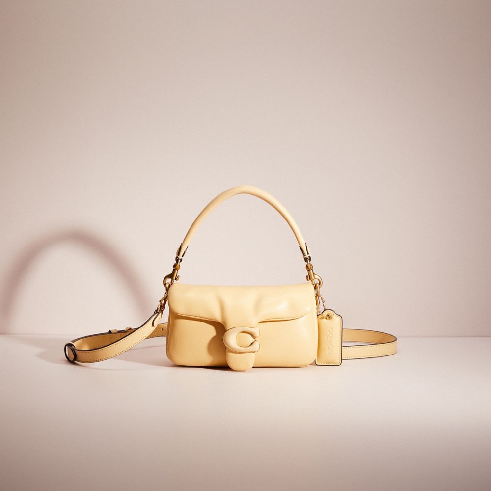 The Pillow Tabby reimagines the structured silhouette of an archival 1970s Coach design with ultra-soft nappa leather and wrapped Signature hardware. The petite 18 features two detachable straps to carry by hand, on the shoulder or wear crossbody.