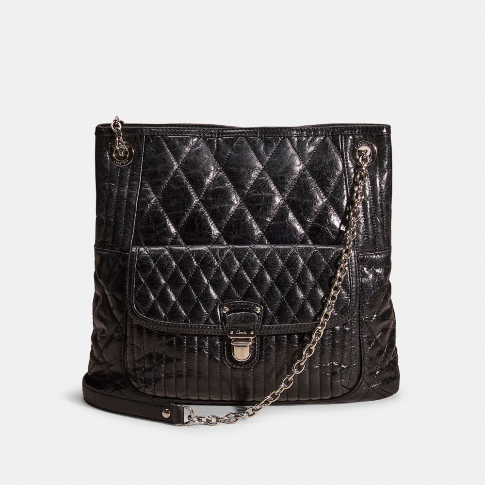Crafted of high-shine metallic leather, the Poppy slim tote features pockets inside and out for plenty of organization. It's finished with a shoulder strap and snap closure.