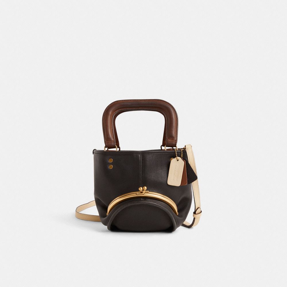 Thoughtfully designed by remixing and reconstructing vintage Coach bags, this Duffle 8 is a unique upcycled design. This one-of-a-kind bag is made by hand combining our iconic Duffle bag with Portfolio Bag handles then adding a kisslock frame to create an exterior front pocket. The petite tote has an interior multifunction pocket to hold small essentials.