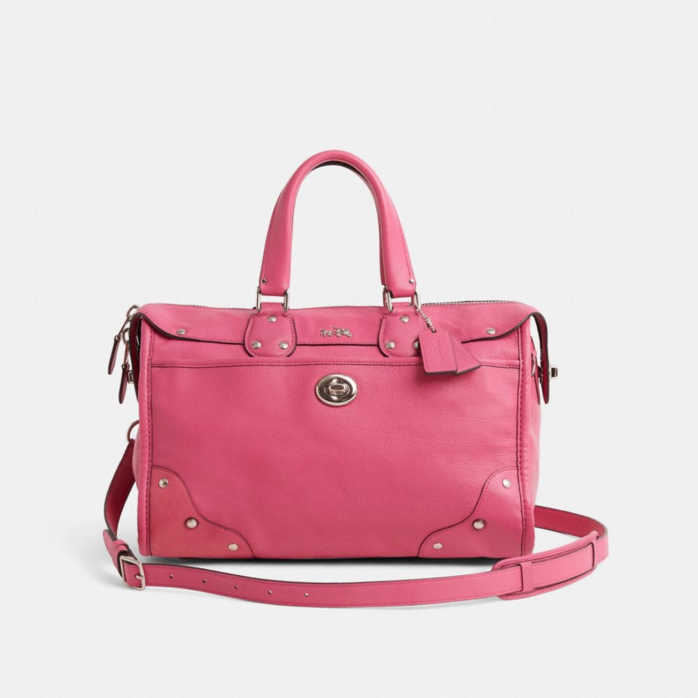 The Rhyder is a soft satchel with a downtown attitude. Finished with luxe craftsmanship of smooth leather with rivets, heritage turnlocks and archive-inspired leather bindings, it features interior multifunction pockets.