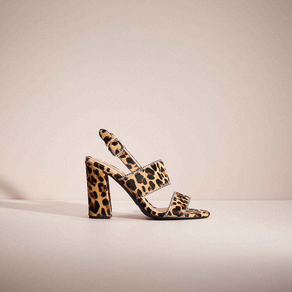 Gleaming beadchain detail adds a touch of shine to Rylie sandal. The slingback style has a chunky mid-height heel and is crafted of luxurious exotic-print haircalf.