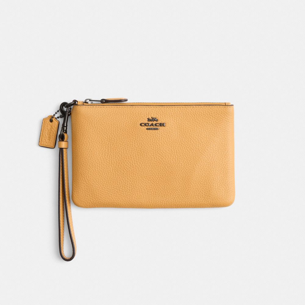 Crafted of polished pebble leather, this wristlet is perfectly sized for cards, cash and a phone. Wear it on your wrist or clip it inside a larger Coach bag.