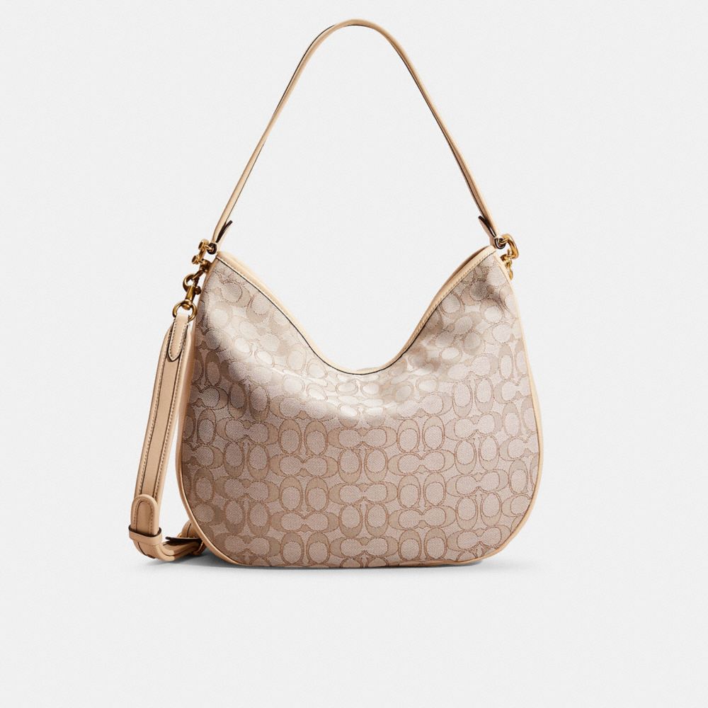 A modern take on an archival 1970s Coach design, our soft Tabby hobo is crafted of our environmentally conscious Signature jacquard made of organic cotton. It's all part of our commitment to rethinking and reducing our impact on the planet by repurposing waste materials. This style is finished with smooth leather accents, our Signature hardware and multiple pockets.