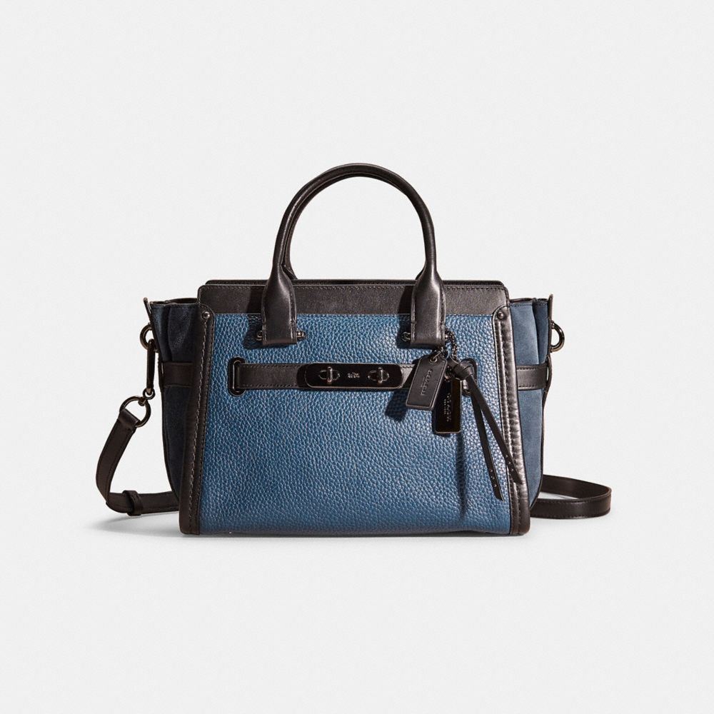 Statement belting with double-turnlock hardware adds "swagger" to a simple shape inspired by archival Coach designs. The compact 27 is crafted in a mix of rich leather and soft suede, with an outside slip pocket for easy access to essentials.