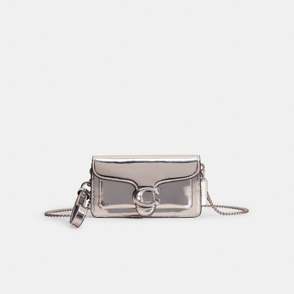 A modern take on an archival 1970s Coach design, our structured Tabby wristlet is crafted of lustrous mirror metallic leather. Finished with our Signature hardware, it's perfectly sized for cards, cash and a phone with an exterior slip pocket for easy access to essentials. The versatile style can be carried as a wristlet or a clutch and worn crossbody with the elegant chain strap, making it the perfect choice for both dressed up and casual looks.