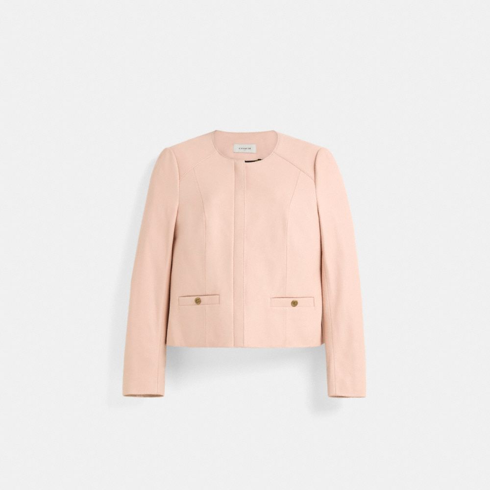 Crafted of buttery-soft leather, this collarless design is a feminine take on a classic racer style.