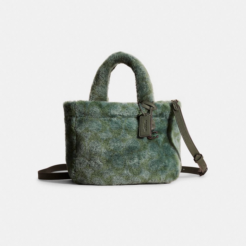 Our Tote 22 is a cozy-luxe style crafted of plush dyed shearling printed with our iconic Signature pattern. Finished with nappa leather trim, this compact carryall features an inside pocket and a detachable strap for hands-free wear on the shoulder or crossbody.