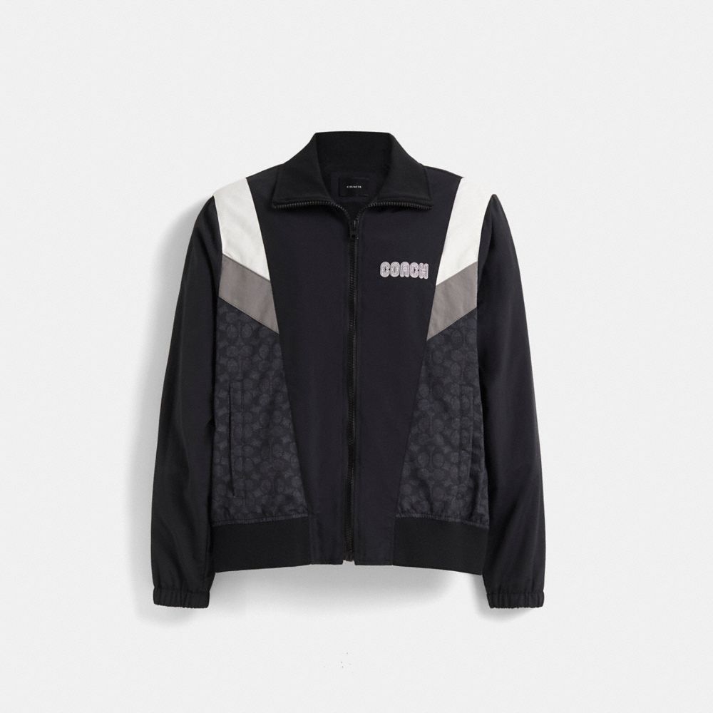 Upgrade your on-the-run style with this retro-inspired track jacket. With a high neck to protect from the chill, the lightweight sporty style features colorblock paneling detailed with our Signature, slip pockets and our Coach retro graphic.