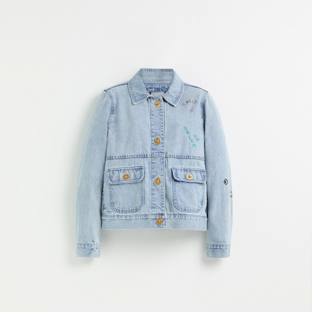Redefine the blues with this washed cotton denim jacket featuring our iconic turnlock hardware for a heritage touch. Colorfully embroidered with playful symbols, sayings and Coach icons, this classic fit silhouette is detailed with patch pockets and distinctive topstitching.