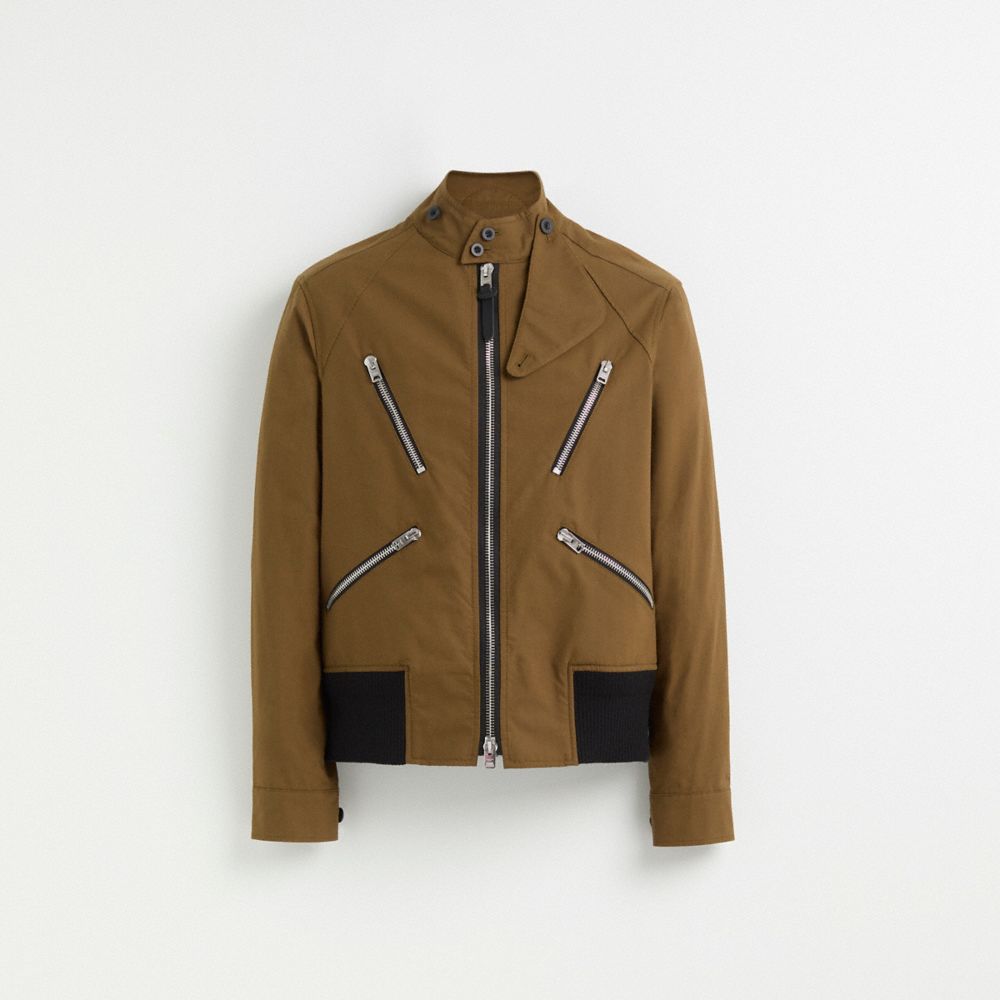 Heavy-gauge zippers and leather patches at the back modernize a military-inspired silhouette. Lined with Gary Baseman's subversive take on plaid, this jacket honors tradition with a throat latch usually found on trench coats.