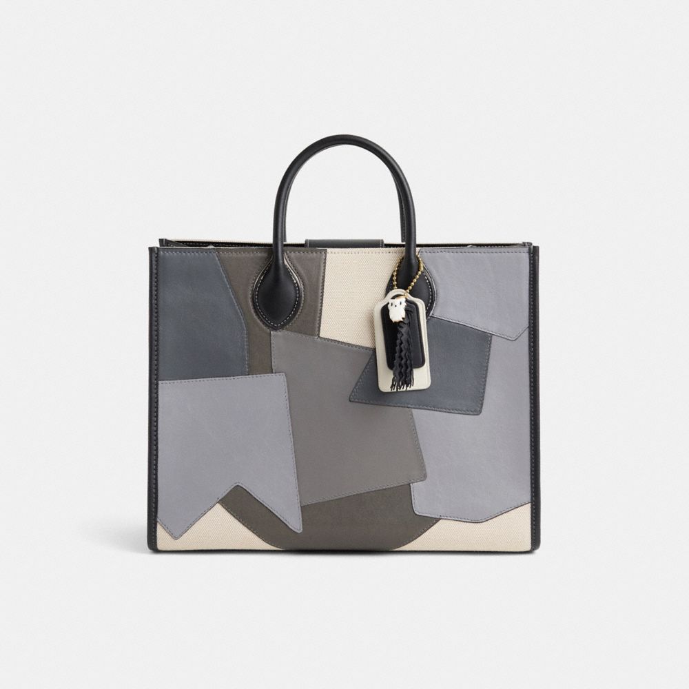 Reimagined by Eunice Chang with a dynamic mosaic patchwork made up of sophisticated grey and blue-hued leathers, this structured style has been expertly cleaned, conditioned and restored. Our talented craftspeople Jose Reyna, Alfred Deaza and Yngrid Pichardo Baez embellished the front with Coach remnants, replaced the edge binding, repaired edgestains on the handles, then added a playful repurposed charm. This spacious Ace 35 is crafted of durable canvas and refined leather. Featuring an inside zip pocket to hold small essentials and space for a phone, tablet and 13” laptop, it’s finished with a detachable strap for hands-free wear on the shoulder or crossbody.