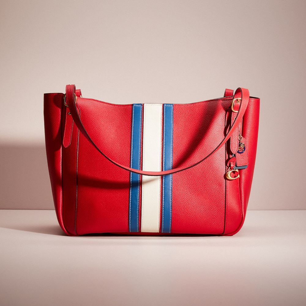 Reimagined with a sporty Varsity vibe in classic American hues by Nikita M’Bouroukounda, this spacious style has been expertly cleaned, conditioned and restored. Our talented craftspeople Alfred Deaza and Kendry Almonte de Torres hand-decorated it with a Coach Varsity Stripe and added a playful repurposed charm. An essential carryall, our Alana is a generously-sized design with a single compartment. Crafted of durable polished pebble leather, it secures with a zip-top closure.