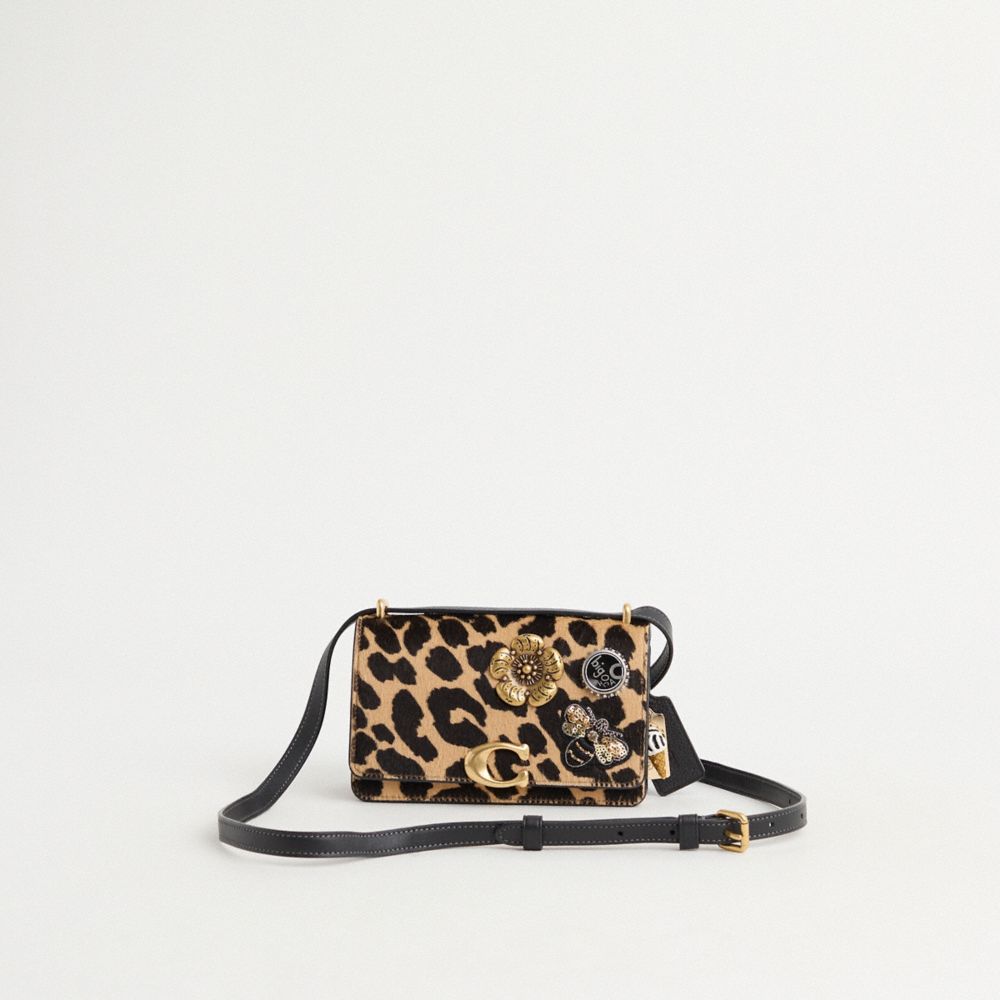 Reimagined with eclectic embellishments for a bit of whimsy by Savannah Sutton, this sophisticated style has been expertly cleaned, conditioned and restored. Our talented craftsperson Jose Reyna hand-decorated the flap with ornate patches and pins, then added a playful repurposed charm. Detailed with our C pushpin closure, this flap front Bandit crossbody is crafted of buttery soft glovetanned leather and luxe silky haircalf printed with a bold leopard pattern inspired by archival 1960s designs of Bonnie Cashin, our first lead designer. The dual compartment design features a secure interior snap pocket, a convenient exterior pocket and a shoulder strap that adjusts for crossbody wear.