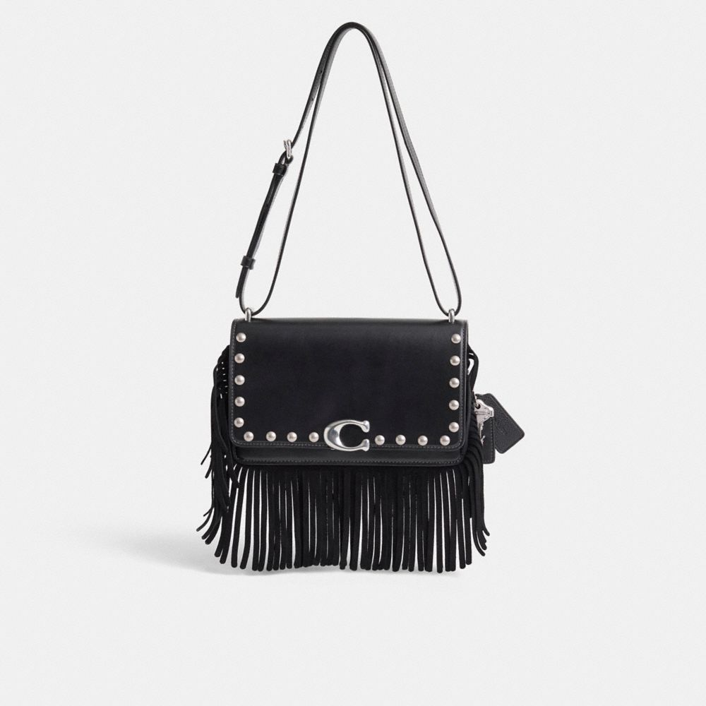 Reimagined by Eunice Chang with statement-making fringe and silvery border rivets for a rock ‘n’ roll edge, this flap-front style has been expertly cleaned, conditioned and restored. Our talented craftspeople Jose Reyna and Yngrid Pichardo Baez attached swingy dense fringe along the edges, hand decorated the front with polished studs, attached the same silvery rivets to the interior lining, reshaped the flap and added a playful repurposed charm. Detailed with our C pushpin closure, the Bandit is crafted of luxe refined leather with a high shine finish. It features two organized compartments, a secure interior snap pocket and a shoulder strap that adjusts for crossbody wear.