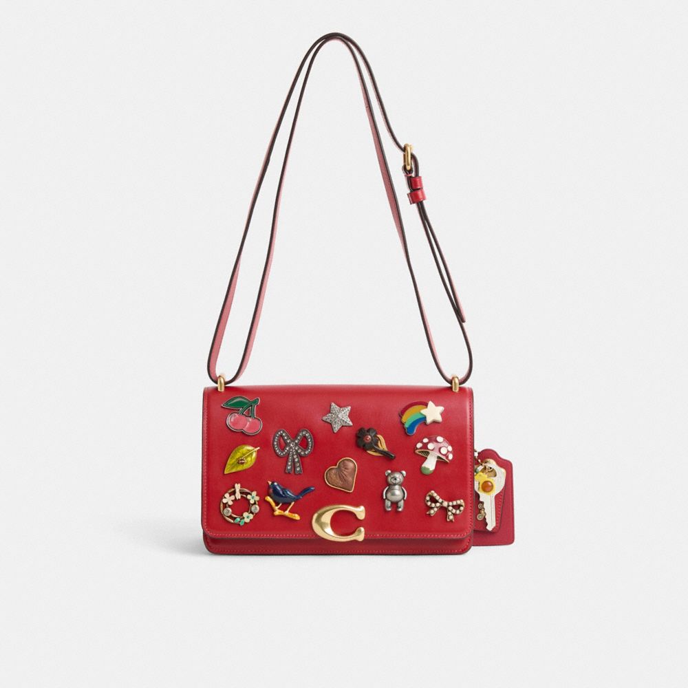 Reimagined with an eclectic mix of playful and vintage-inspired pins by Eunice Chang for a whimsical finish, this sophisticated style has been expertly cleaned, conditioned and restored. Our talented craftspeople Ella Mulley, Nicole Izquierdo and Michelle Barquet hand-decorated the flap with a mix of iconic Coach embellishments, polished all hardware, painted the leather button on interior pocket, then added a playful repurposed charm. Detailed with our C pushpin closure, the flap front Bandit is crafted of luxe refined leather with a high shine finish. It features two organized compartments, a secure interior snap pocket and a shoulder strap that adjusts for crossbody wear.