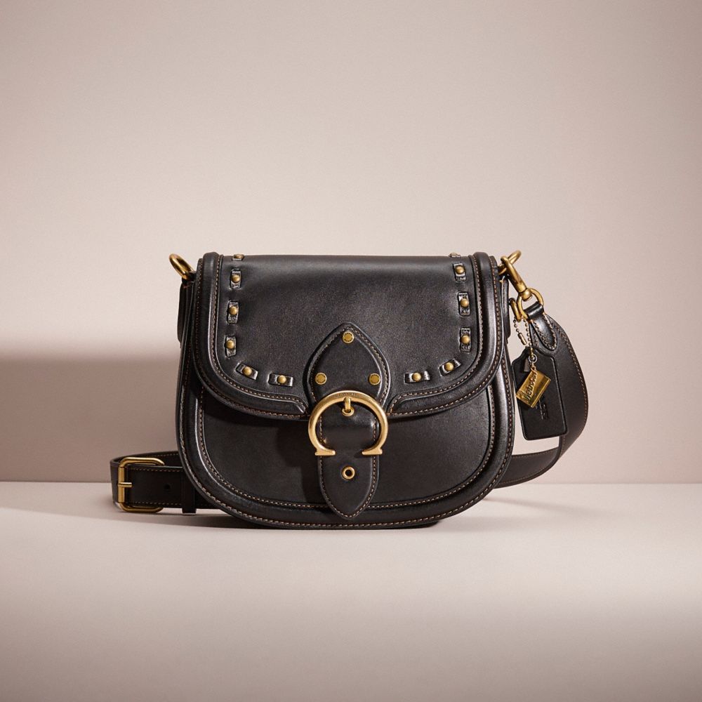 Reimagined with a high-shine graphic edge by Savannah Sutton featuring hand-laced pick stitching accented with golden rivets, this equestrian-inspired style has been expertly cleaned, conditioned and restored. Our talented craftspeople Jose Reyna and Yngrid Pichardo Baez embellished the flap with riveted pick stitching, touched up the edgestain and added a playful repurposed charm. Inspired by the heartbeat of New York City, our buttery soft glovetanned leather Beat saddle bag features inside multifunction pockets, an outside pocket for easy access to essentials and a secure snap closure accented with our Coach buckle. Endlessly versatile, it can be worn on the shoulder or crossbody for convenient hands-free wear.