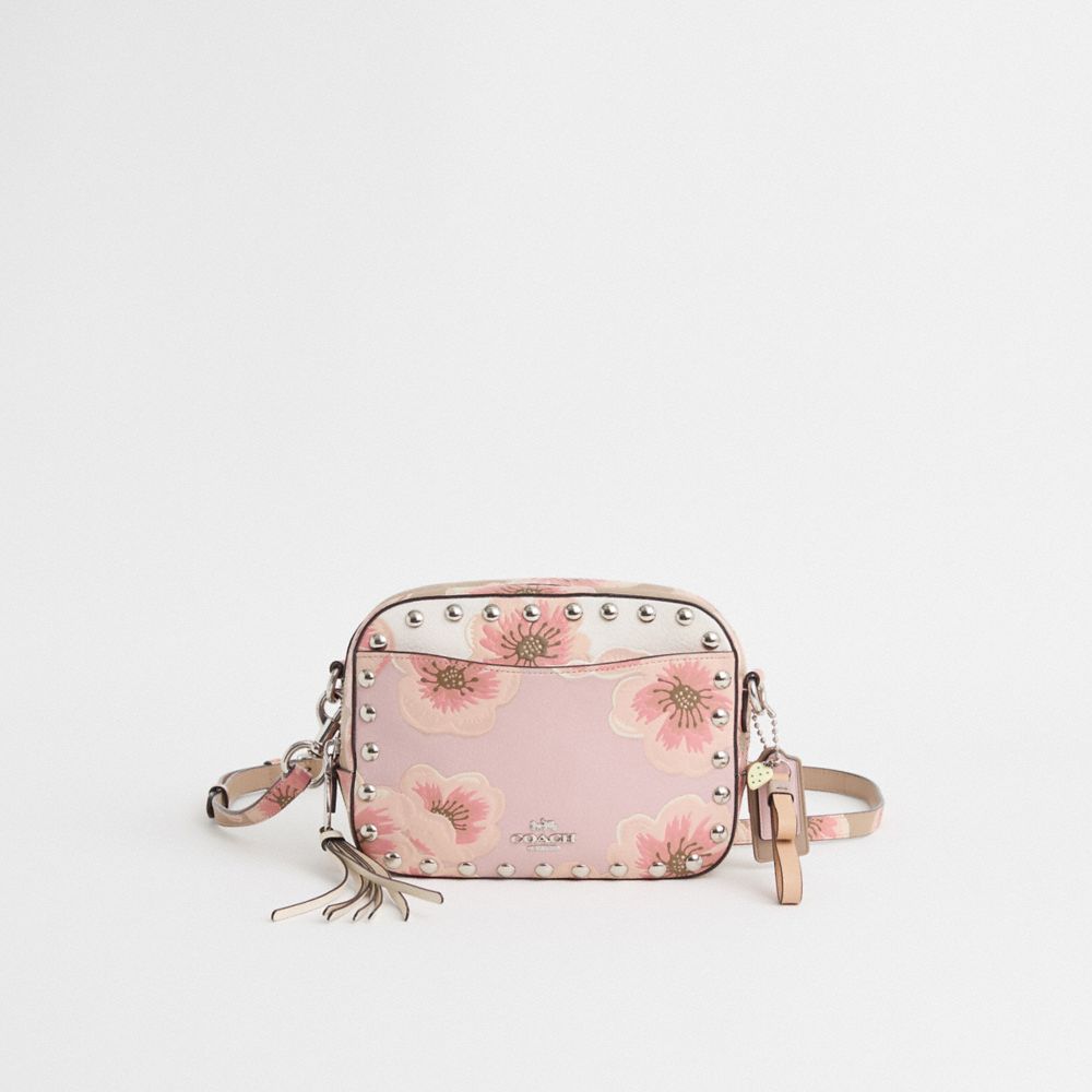 Reimagined with striking border rivets for a distinctive finish by Rose Oliva, this compact style has been expertly cleaned, conditioned and restored. Our talented craftspeople Jose Reyna and Michelle Barquet embellished the front with silvery studs, repaired stitching and threads, spot-painted the front and added a playful repurposed charm. Inspired by vintage camera bags, this lightweight crossbody has room for a small wallet, sunglasses, keys and a phone. Finished with an adjustable crossbody strap and an outside pocket for easy access to essentials, it's crafted of glovetanned leather featuring a beautiful Sakura blossom print.