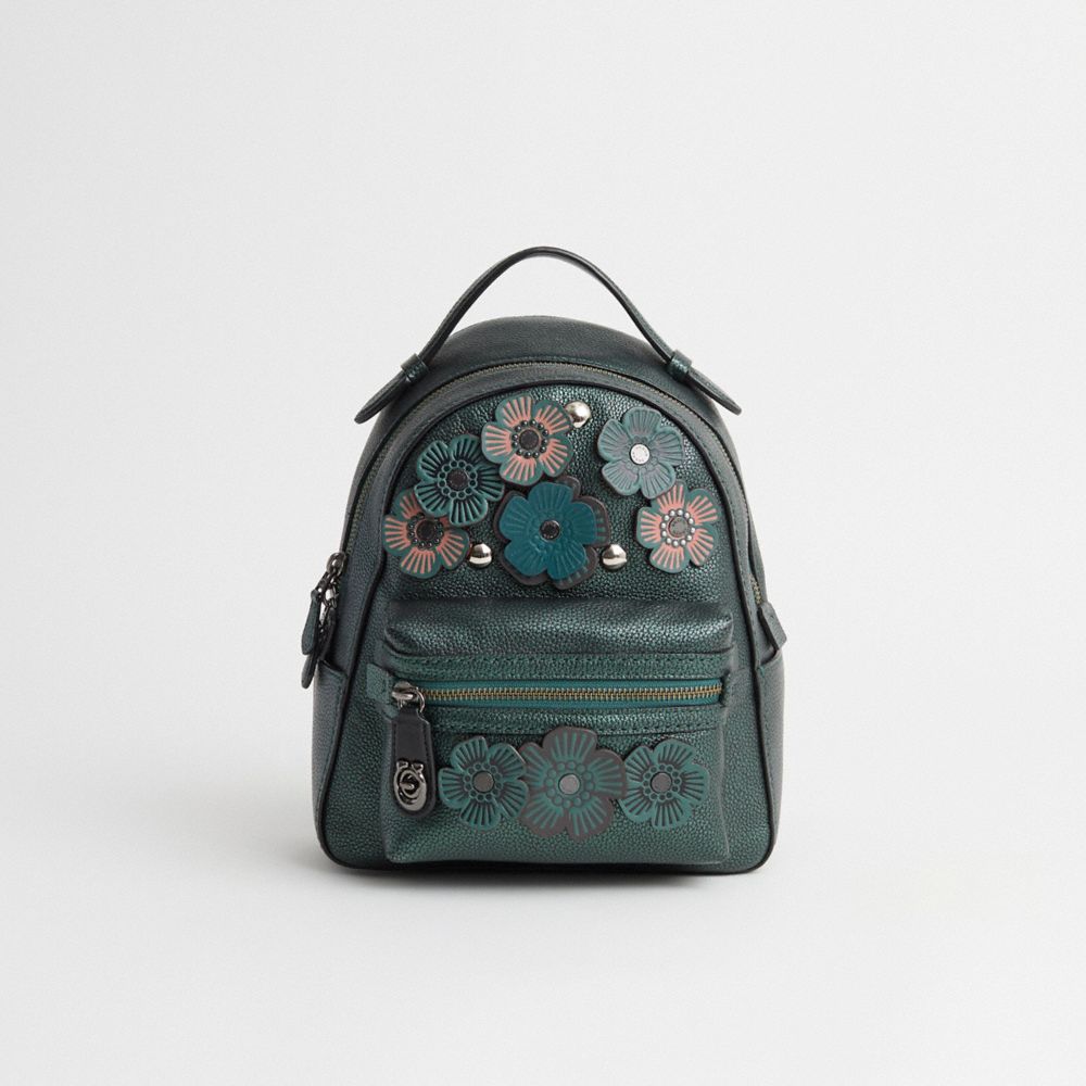 Reimagined by Savannah Sutton with an abundance of our dimensional Tea Rose appliqué in a dreamy coastal-inspired color palette, this hands-free style has been expertly cleaned, conditioned and restored. Our talented craftspeople Yngrid Pichardo Baez and Jose Reyna embellished the front and pocket with die-cut leather blooms and peek-a-boo rivets, repaired threading on the pocket and added a playful repurposed charm. The petite Campus Backpack 23 is crafted of polished pebble leather with a brilliant metallic sheen. It's designed with adjustable shoulder straps and an exterior pocket for easy access to essentials.