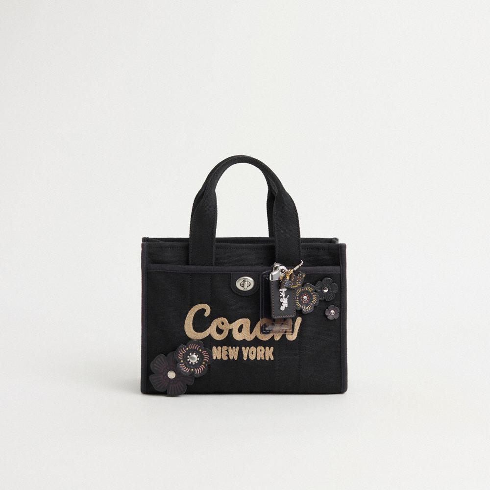 Reimagined with clusters of our dimensional Tea Rose appliqué in darkly dramatic hues by Eunice Chang, this spacious style has been expertly cleaned, conditioned and restored. Our talented craftsperson Alfred Deaza hand-decorated the front with die-cut leather blooms, applied leather behind the turnlock hardware, then added a playful repurposed charm. Detailed with our cursive Coach script embroidery and iconic turnlock closure, this lightweight Cargo 26 has an open interior with room for an iPad, two outside pockets for easy organization and a removable webbing strap for shoulder or crossbody wear. Crafted to last, this versatile carryall is made with cotton sourced from farms that use regenerative agricultural practices that help to maintain and rejuvenate land, increase biological diversity, and soil health, and could lead to increased carbon absorption. Just the bag itself, not the trims and straps.