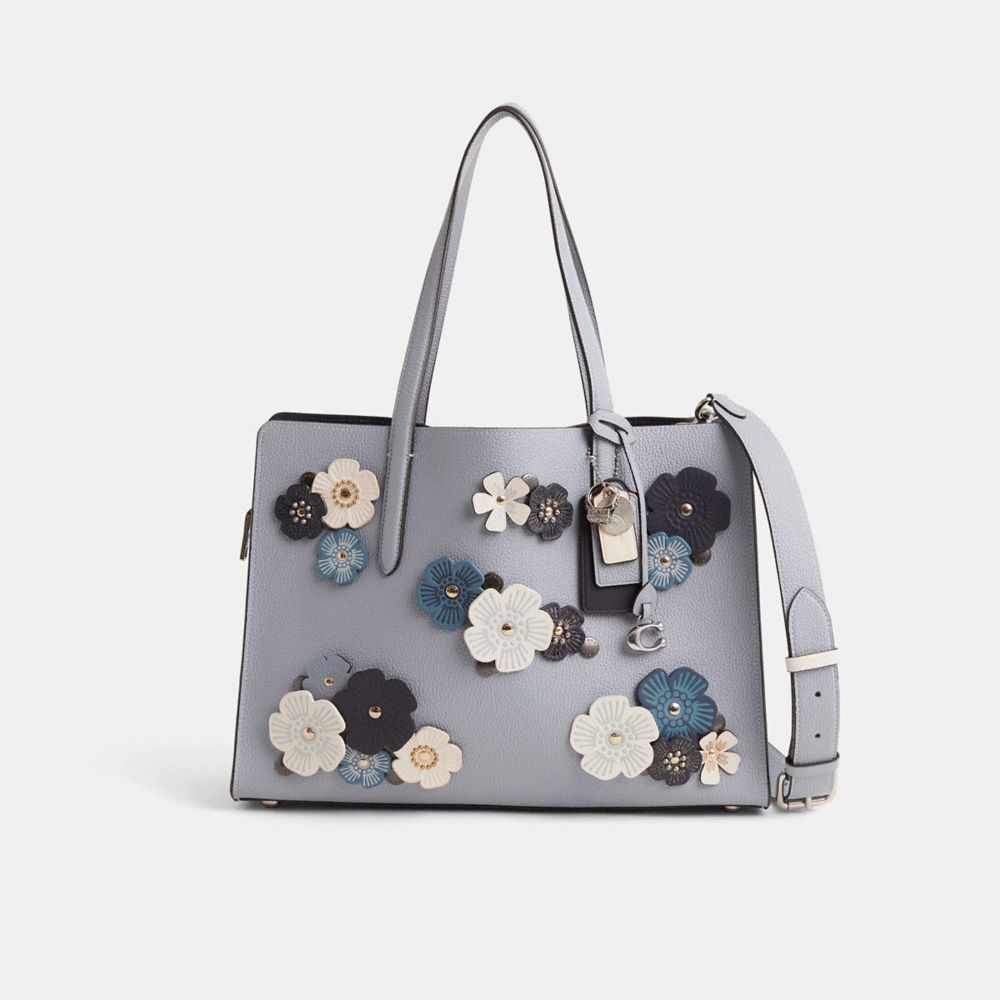 Reimagined by Ella Mulley with blooming clusters of our dimensional Tea Rose appliqué in a dreamy coastal-inspired color palette, this spacious style has been expertly cleaned, conditioned and restored. Our talented craftspeople Angel Penaloza and Nicole Izquierdo hand-decorated the front with die-cut leather blooms and peek-a-boo rivets, refreshed the back and added a playful repurposed charm. Perfectly put-together, our minimalist Carter carryall effortlessly takes you from work to weekend. Featuring three organized compartments, multifunction pockets and space for a 12" laptop, this polished pebble leather design is finished with a detachable crossbody strap.