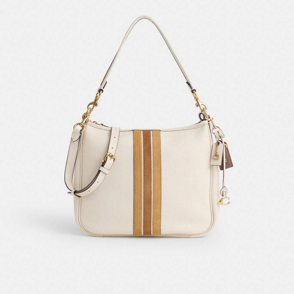 Reimagined with a distinctive Varsity Stripe in warm earth tones by Rose Oliva, this zip-top style has been expertly cleaned, conditioned and restored. Our talented craftspeople Nicole Izquierdo, Fernando Gutierrez and Yngrid Pichardo Baez hand-decorated the front with a Coach Varsity Stripe, applied sweet heart patches to the interior, repaired threads, refreshed the corners and added a playful repurposed charm. Deliberately slouchy with a sophisticated ease, our Cary is a study in intentional laidback style. Crafted of buttery soft pebble leather with a silky sheen, this surprisingly spacious bag has plenty of pockets to keep you organized.